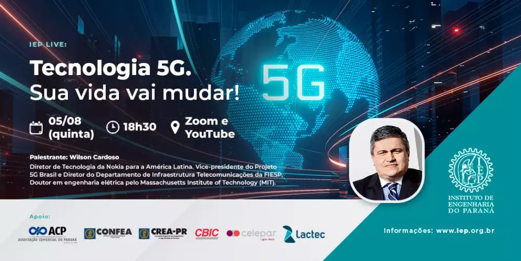 No dia 05 de agosto será realizada uma live com o diretor de tecnologia da Nokia para a América Latina, Wilson Cardoso, sobre o uso de tecnologia 5G. Este evento conta com o apoio da Celepar, e está com as inscrições abertas e gratuitas. O evento é promovido pelo Instituto de Engenharia do Paraná.