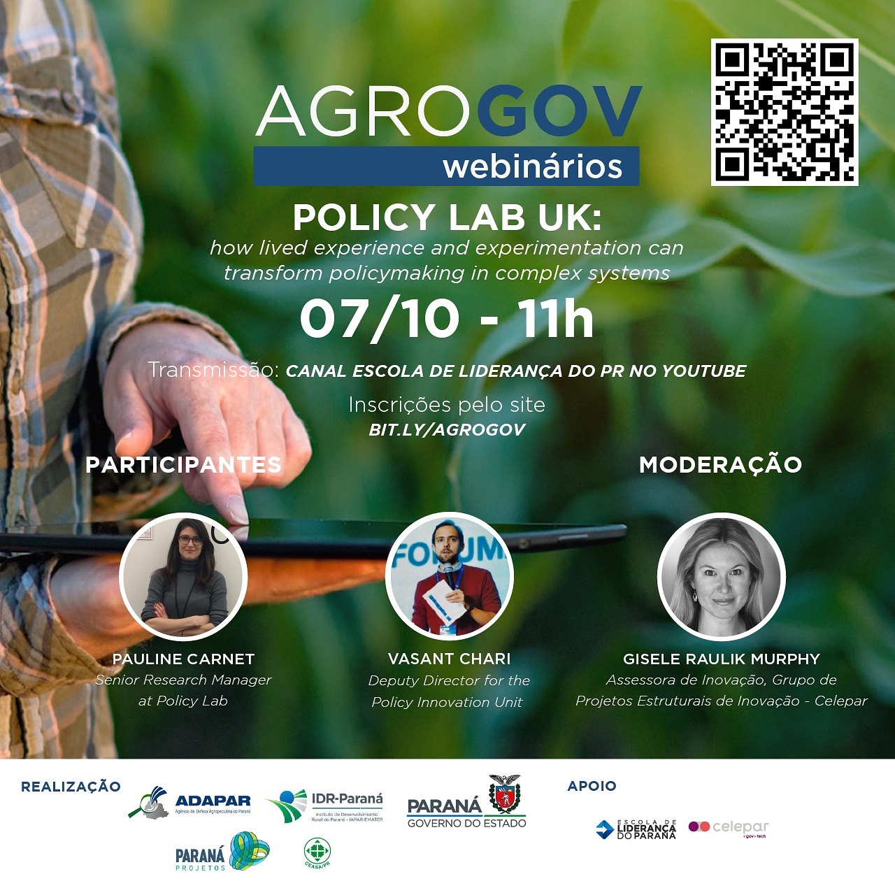 O tema da palestra desta quarta será “Como a experiência e a experimentação podem transformar a formulação de políticas em sistemas complexos”. Falarão sobre o tema dois palestrantes que integram o governo britânico: Pauline Carnet, pesquisadora e dirigente do Policy Lab, e Vasant Chari, do Departamento de Inovação do Police Lab. A moderadora será Gisele Raulik Murphy, da Celepar.